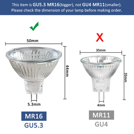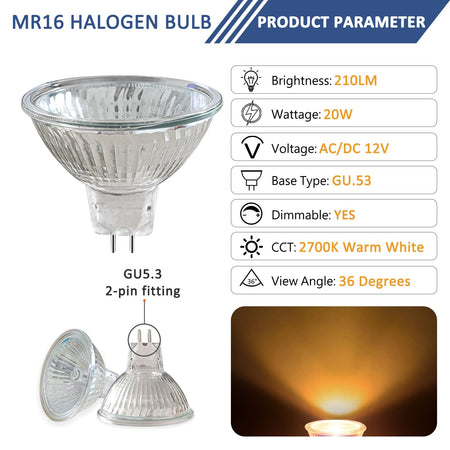 - GU5.3, 20 W, 12V: 8 st * MR16 GU5.3 halogenlampa 20W dimbar. Dubbelpolig GU5.3-kontakt, standard MR16, 210 lumen, ø50 x 44 mm, ingångsspänning 12 V. Kontrollera matchningen mellan spänning och storlek innan du köper.