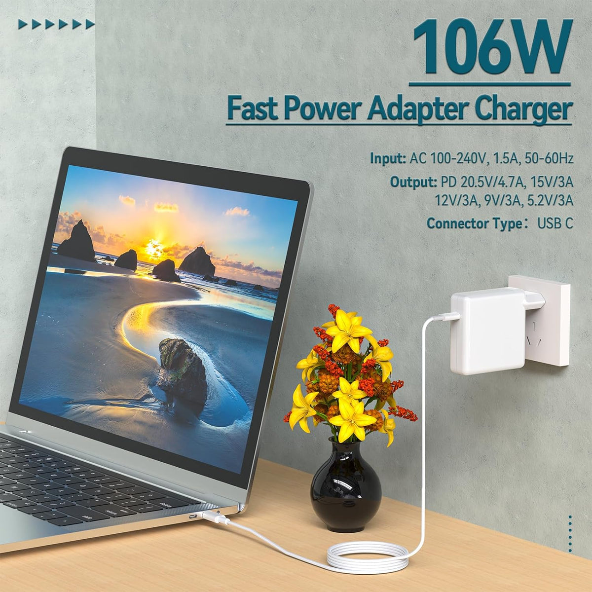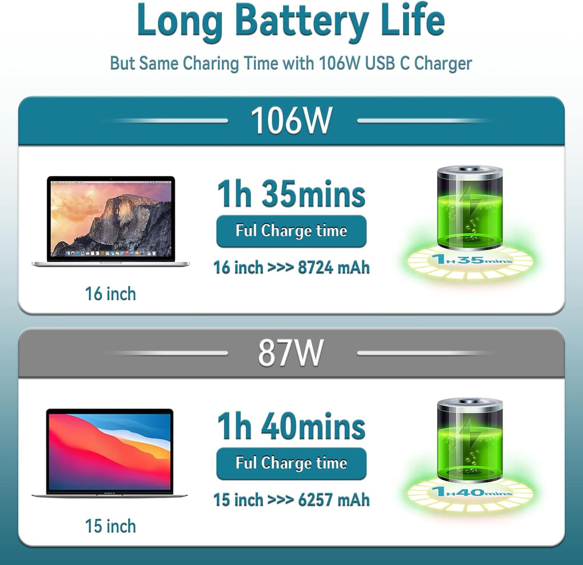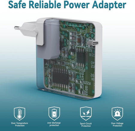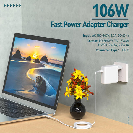 - ❤❤ Höghastighetsladdning: 106W MacBook Pro USB C laddare erbjuder hög laddningseffektivitet på upp till 96 %. Ladda din MacBook Pro 16" på bara 1 timme och 30 minuter. De flesta USB-C-mobiltelefoner kan laddas 0% till 80% på 20 minuter.。Laddaren kommer automatiskt att känna igen din enhet och ge den mest effektiva uteffekten enligt den kraft som krävs av enheten, vilket gör laddningen snabbare och säkrare.