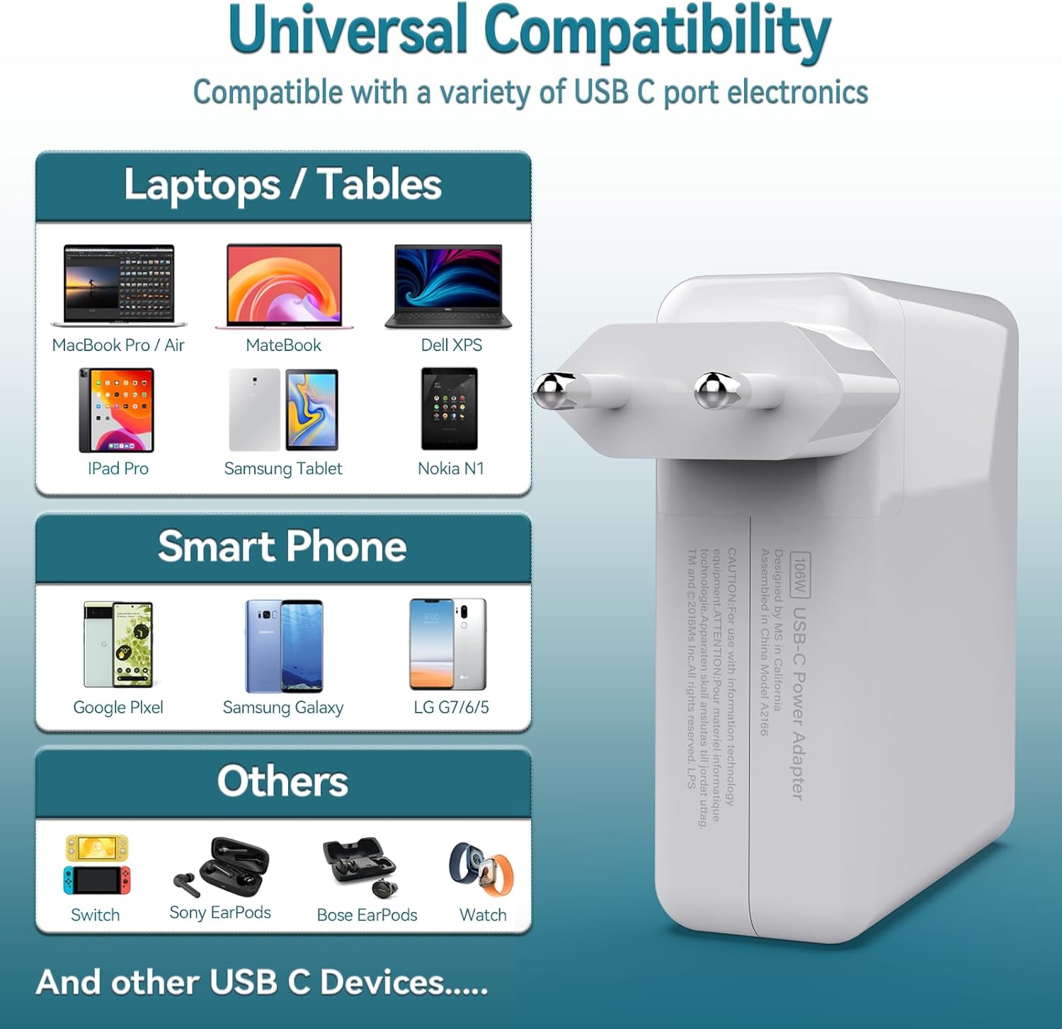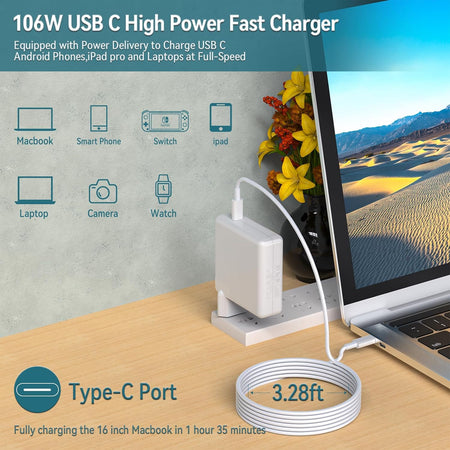 - 🎁 En för alla: 106W USB C laddare med PD 3.0-teknik för höghastighetsladdning av praktiskt taget alla USB-C-mobila enheter. Högre laddningskraft än 100W/96W/87W/67W/61W/30W/29W USB-C-laddare.