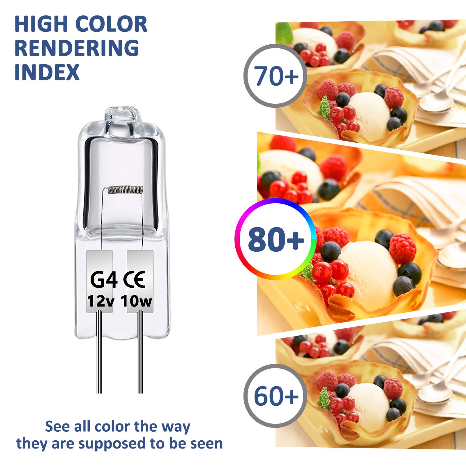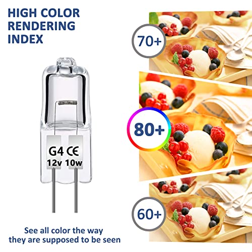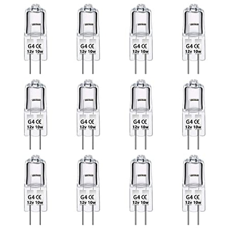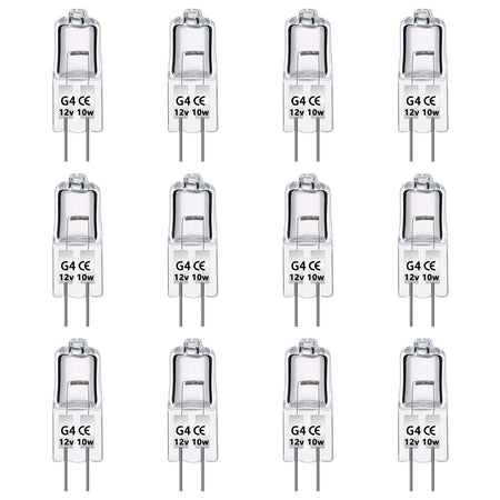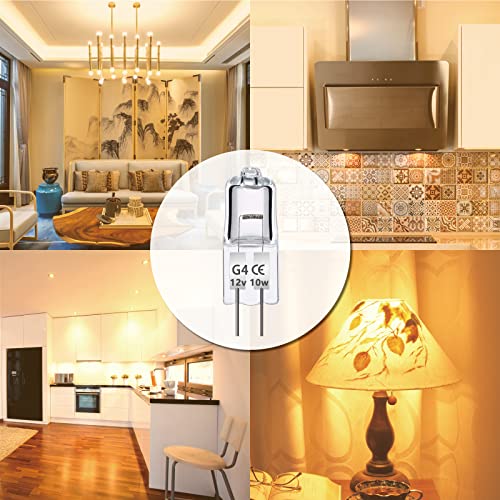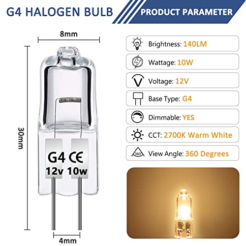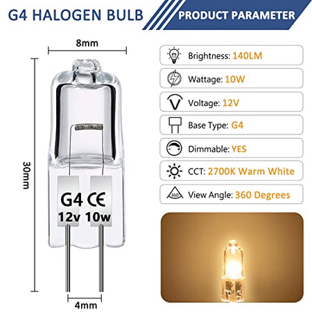 - Lång livslängd: Storlek: 30 x 8 mm. Halogen G4 12 V 10 W levererar upp till 140 lm varmt vitt ljus 2 700 K för att fylla ditt hem med värme och ljusstyrka. Lampans genomsnittliga livslängd är 2 000 timmar. Ingen frekvent ersättning krävs.