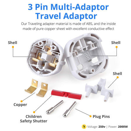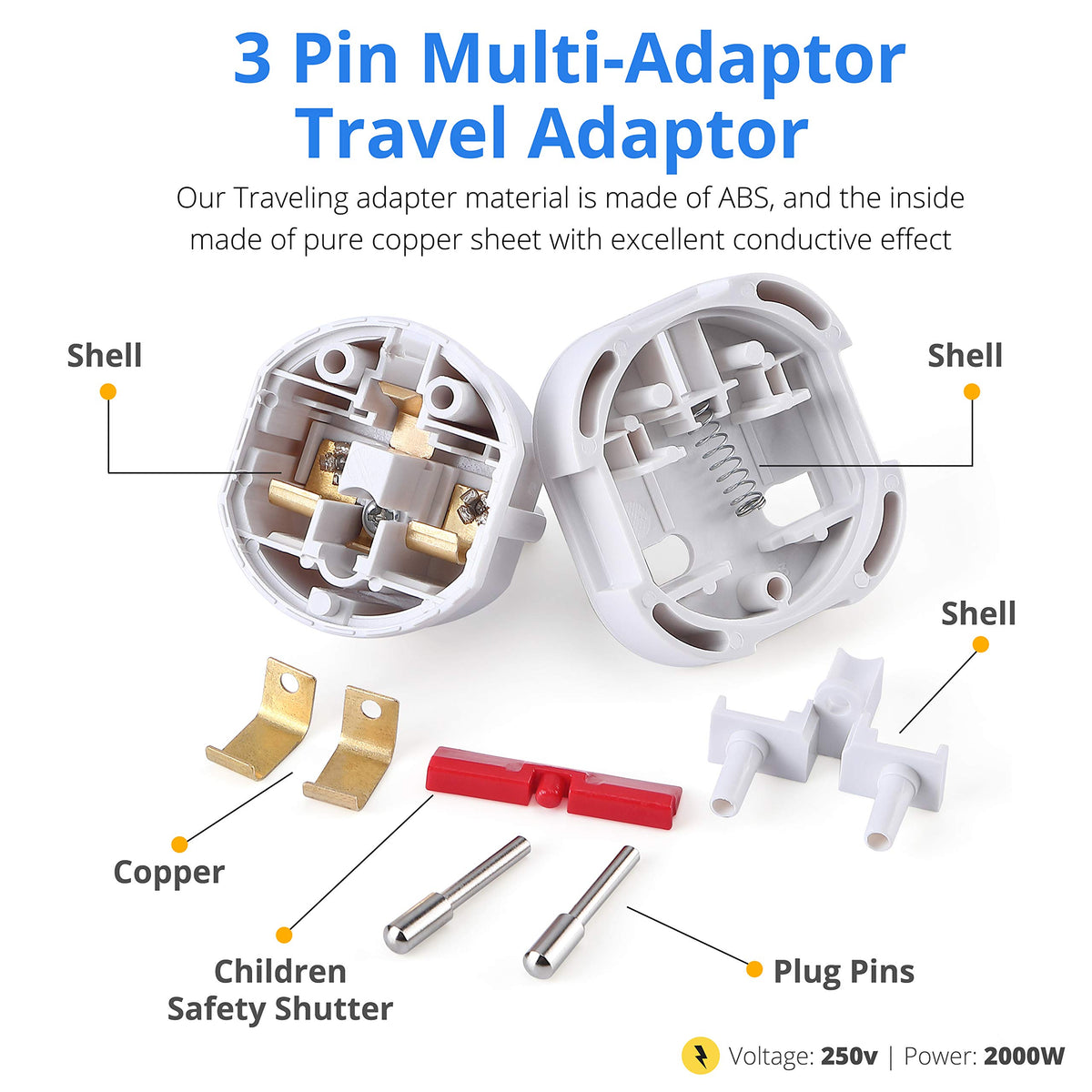 - Varning: Dessa reseproppar tjänar endast till att konvertera en 3-polig typ G till 2-polig typ C, E, F-pluggar! Dessa används inte för att konvertera spänning och uteffekt. Betyg 10A, 240V