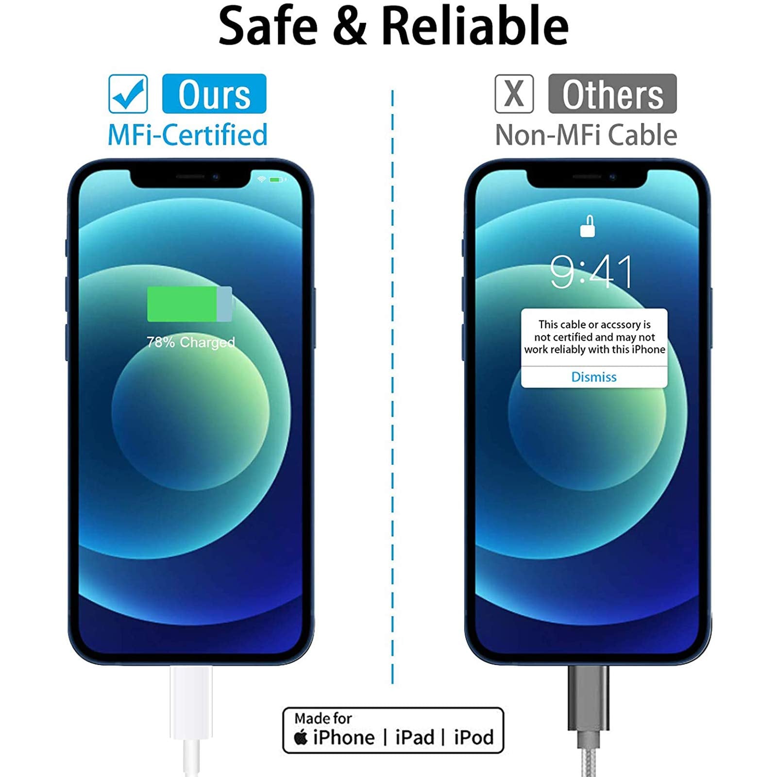 - ⚡【Säker snabbladdning och dataöverföring】- iPhone Lightning-kabelsladd med förstärkt fogdesign, laddningskabeln stöder säker höghastighetsladdning och snabb dataöverföring vilket gör att du kan ladda din enhet bättre och snabbare. Inbyggt Apple-originalchip för att säkerställa att inget varningsmeddelande dyker upp
