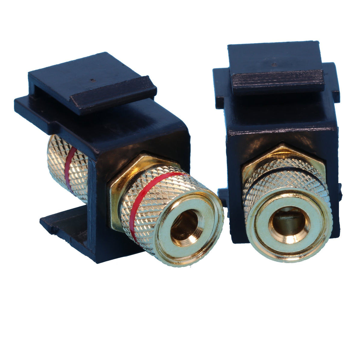 RiteAV Female to Female Banana Jack Keystone Couplers are the same on the front and back, so you can connect your Speaker Wire to them in no time. Theyre color-coded red and black on the front and back side of the coupler, so that polarity can be easily identified. Simply plug your terminated wire into the front and back the same way. No tools are required. If youre using bare wire, you may unscrew the caps and use the binding posts to terminate bare wire. The Gold Plated Binding Post provides a reliable connection providing superior conductivity and sharp audio. The couplers are universally designed to easily fit standard-sized brand name keystone blank wall plates and fit seamlessly into all RiteAV Blank Wall Plates as well. Our Banana Jack Keystone Couplers can also be used in surface mount boxes and patch panels that have standard-sized openings. RiteAV Keystone Couplers are removable to allow for easy upgrades or plate re-configurations in the future. The sturdy construction of our couplers ensure a long service life and a simple, affordable way to keep your cables hidden. They also provide a neat, convenient way to extend cables that are already in place, without the need for relocating them. This discreet solution enables you to route your wiring through the walls and results in a clean, professional look behind wall mounted televisions, monitors, projectors and entertainment centers in both residential (home theater) and commercial (classroom, boardroom, factory floor, recording studio, etc.) settings. Please note that Speaker Wire is not included with the product. It is referenced as an item that the Banana Jacks may be used with. Our 2 Pack includes 2 units (1 x Banana Keystone Coupler with a Black Ring and 1 x Banana Keystone Coupler with a Red Ring). The 2 Pack is designed for use with one speaker, so please purchase additional packs if your setup includes multiple speakers.