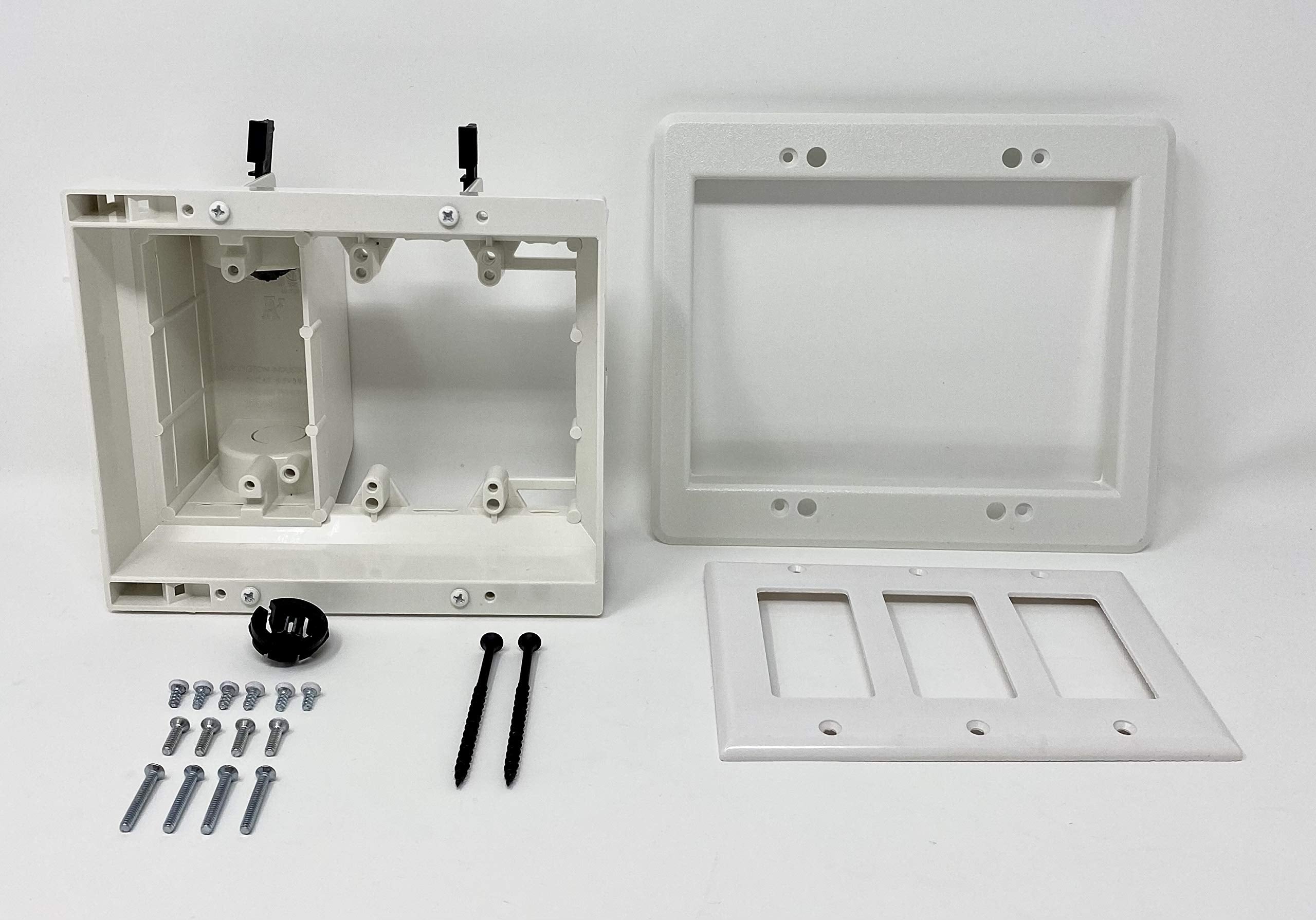 RiteAVs Three-Gang Recessed Non-metallic Electrical Combo Box divided for power and low voltage - White is easy to install and provides a safe and secure solution for keeping your wires organized. Its sturdy PVC construction ensures reliability while safeguarding it from corrosion, rust and conducting electricity. The incorporated stationary panel separates the electrical receptacle from the low voltage cabling (i.e. cable, internet and phone) and therefore preventing damage to those connections and eliminating interference while keeping everything contained in one box. The flexible design enables it to be utilized for both old and new work and includes the mounting hardware for both options. It adjusts to fit 1/4 to 1 1/2 thick drywall, wall board or paneling. The textured trim plate conceals the edges of the opening in the wall and is paintable to match your decor for a more finished look. The box measures 7.93 W x 6.82 H and is 3.88 D (at its deepest point) and weighs 0.83 lbs. The package includes the following: 1x two-gang combo box, 1 x trim plate, 1 x decorative surround, 2 x NM94 Push-In Cable Connectors (one is preinstalled in the box and the other can be snapped into the second knockout during installation), 2 x 3 inch screws, 6 x 1/2 inch screws and 4 x 1 inch screws (for optional use when installing the trim plate to the box). All RiteAV Three-Gang Power (Single Receptacle)and Low Voltage Wall Plates fit seamlessly to the combo box for a simple and affordable way to keep your cables hidden. This discreet solution enables you to route your cabling through the walls and results in a clean, professional look behind wall mounted televisions, monitors, projectors and entertainment centers in both residential (home theater) and commercial (classroom, boardroom, factory floor, recording studio, etc.) settings. The RiteAV Combo Box is also available in black and in a Two-Gang Option to suit a variety of audio visual needs.