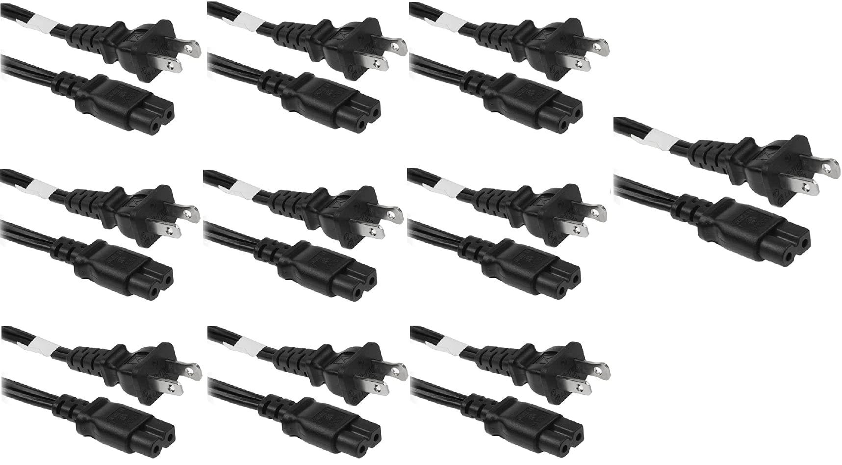 RiteAVs 15 Feet 18 AWG 2-Slot Polarized Power Cord IEC320C7 to NEMA 1-15P is commonly used as a replacement cord for Audio/Video Equipment like DVD Players, VCRs and Boom Boxes or laptops and notebooks that utilize a North American Power Plug. One end of the cord is fitted with a 1-15P Plug which connects to standard North American receptacles (wall outlets) and the opposite end has the C7 which connects to consumer electronics, personal computers, office and instrumentation equipment or other hardware outfitted with a C8 inlet. The cords are polarized which ensures that the hot and neutral wires are in proper alignment, so the cable is more secure. Its durable construction provides enhanced reliability and a long service life.Our multipurpose extension cords are UL Listed, CSA Certified and RoHS Compliant. RiteAV offers a variety of power cords, so be sure to check out our full product line. This listing is for a 10 Pack.