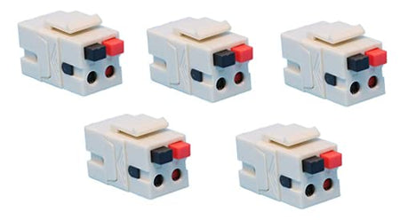 RiteAV Speaker Spring Clip Keystone Jacks are the same on the front and back, so you can connect your wire to them in no time. Simply push in the color-coded, spring loaded buttons and insert the wire on both sides of the plate the same way. No tools are required. Theyre literally push and play, so the installation process is simplified, while the sound quality is not compromised. The couplers provide clear, crisp Hi-Fi Sound for Home Theater and Audio Systems alike. Theyre universally designed to easily fit standard-sized brand name keystone blank wall plates and fit seamlessly into all RiteAV Blank Wall Plates as well. RiteAV Keystone Couplers are removable to allow for easy upgrades or plate re-configurations in the future. The sturdy construction of the couplers ensures a long service life and a simple, affordable way to keep your cables hidden. This discreet solution enables you to route your cabling through the walls and results in a clean, professional look behind wall mounted televisions, monitors, projectors and entertainment centers in both residential (home theater) and commercial (classroom, boardroom, factory floor, recording studio, etc.) settings. We offer a variety of couplers in an assortment of colors that all match our Blank Wall Plates to suit all of your A/V requirements. This listing is for a 5 Pack.