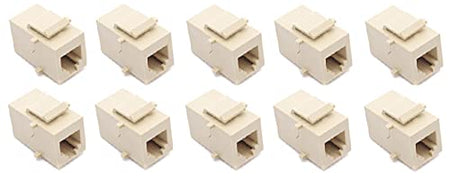 RiteAV Beige RJ11/RJ12 Phone Keystone Jack Female to Female are the same on the front and back, so you can connect your cabling to them in no time. Simply plug your terminated cables into both sides of the plate the same way. No tools are required. Theyre universally designed to easily fit standard-sized brand name keystone blank wall plates and fit seamlessly into all RiteAV Blank Wall Plates as well. Our RJ11/RJ12 Keystone Couplers are versatile, since they can also be used in surface mount boxes and patch panels that have a standard-sized opening. RiteAV Keystone Couplers are removable to allow for easy upgrades or plate re-configurations in the future. The sturdy construction of the couplers ensures a long service life and a simple, affordable way to keep your cables hidden. They also provide a neat, convenient way to extend cables that are already in place, without the need for relocating them. This discreet solution enables you to route your cabling through the walls and results in a clean, professional look behind wall mounted televisions, monitors, projectors and entertainment centers in both residential (home theater) and commercial (classroom, boardroom, factory floor, recording studio, etc.) settings. We offer a variety of couplers in an assortment of colors that all match our Blank Wall Plates to suit all of your A/V requirements. This listing is for a 10 Pack.