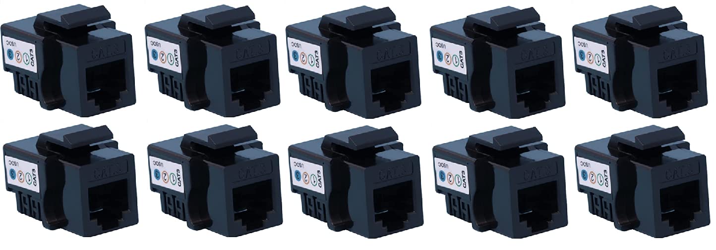 RiteAV RJ11 Phone Black Punchdown Type Keystone Jacks are easy to install since they include a color-coded, integrated wiring diagram, which yields a hassle-free termination. Terminated cables are plugged into the front of the jack and bare wire is punched down on the back of the 110-Type, 90 Degree Punchdown Block using a punchdown tool or IDC tool (not included). The snap-in dust cover/retention clip ensures a dependable, corrosion-free connection. The sturdy construction ensures a long service life and the fabrication delivers timeless style. The Cat3 multipurpose jacks are ideal for use with basic telephone installations, replacements and updating antiquated systems. They can also be used in low speed data network applications, which makes them even more adaptable. We offer a variety of Keystone Coupler Configurations, along with different styles and colors, so please check out RiteAVs full line of Wall Plate Components, Preconfigured Wall Plates that include the most popular inputs and the accompanying cables to connect it all together. The 10 pack is a smart, economical choice when needing to purchase multiple jacks since it saves you money buying in bulk as well as numerous trips to the hardware store.