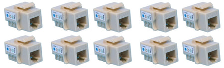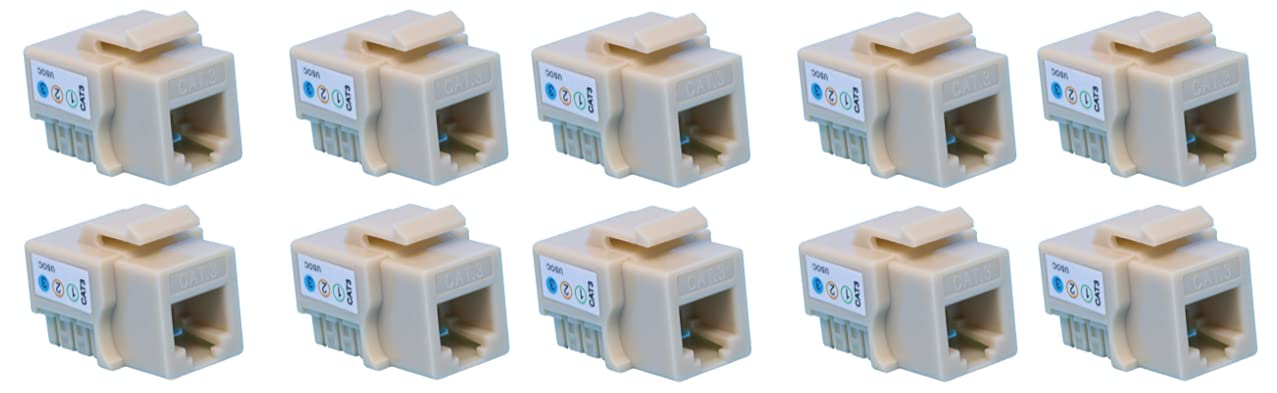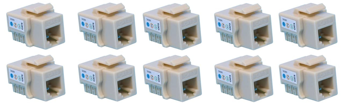 RiteAV RJ11 Phone Beige Punchdown Type Keystone Jacks are easy to install since they include a color-coded, integrated wiring diagram, which yields a hassle-free termination. Terminated cables are plugged into the front of the jack and bare wire is punched down on the back of the 110-Type, 90 Degree Punchdown Block using a punchdown tool or IDC tool (not included). The snap-in dust cover/retention clip ensures a dependable, corrosion-free connection. The sturdy construction ensures a long service life and the fabrication delivers timeless style. The Cat3 multipurpose jacks are ideal for use with basic telephone installations, replacements and updating antiquated systems. They can also be used in low speed data network applications, which makes them even more adaptable. We offer a variety of Keystone Coupler Configurations, along with different styles and colors, so please check out RiteAVs full line of Wall Plate Components, Preconfigured Wall Plates that include the most popular inputs and the accompanying cables to connect it all together. The 10 pack is a smart, economical choice when needing to purchase multiple jacks since it saves you money buying in bulk as well as numerous trips to the hardware store.
