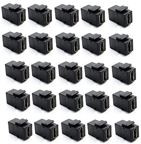 RiteAV Female to Female HDMI Keystone Couplers are the same on the front and back, so you can connect your HDMI Cabling to them in no time. Simply plug your HDMI Cables into both sides of the plate the same way. No tools are required. Theyre universally designed to easily fit standard-sized brand name keystone blank wall plates and fit seamlessly into all RiteAV Blank Wall Plates as well. Our HDMI Keystone Couplers are versatile, since they can also be used in surface mount boxes and patch panels that have a standard-sized opening. RiteAV Keystone Couplers are removable to allow for easy upgrades or plate re-configurations in the future. The sturdy construction of the couplers ensures a long service life and a simple, affordable way to keep your cables hidden. They also provide a neat, convenient way to extend cables that are already in place, without the need for relocating them. This discreet solution enables you to route your cabling through the walls and results in a clean, professional look behind wall mounted televisions, monitors, projectors and entertainment centers in both residential (home theater) and commercial (classroom, boardroom, factory floor, recording studio, etc.) settings. We offer a variety of couplers in an assortment of colors that all match our Blank Wall Plates to suit all of your A/V requirements. The 25 pack is a smart, economical choice when needing to purchase multiple jacks since it saves you money buying in bulk as well as numerous trips to the hardware store.