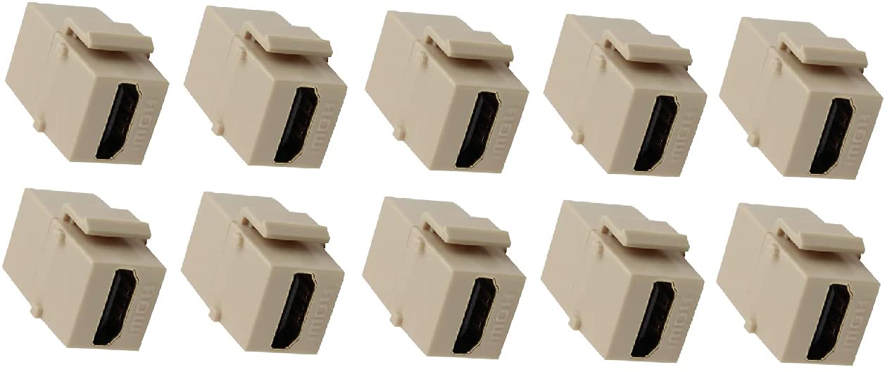 RiteAV Female to Female HDMI Keystone Couplers are the same on the front and back, so you can connect your HDMI Cabling to them in no time. Simply plug your HDMI Cables into both sides of the plate the same way. No tools are required. Theyre universally designed to easily fit standard-sized brand name keystone blank wall plates and fit seamlessly into all RiteAV Blank Wall Plates as well. Our HDMI Keystone Couplers are versatile, since they can also be used in surface mount boxes and patch panels that have a standard-sized opening. RiteAV Keystone Couplers are removable to allow for easy upgrades or plate re-configurations in the future. The sturdy construction of the couplers ensures a long service life and a simple, affordable way to keep your cables hidden. They also provide a neat, convenient way to extend cables that are already in place, without the need for relocating them. This discreet solution enables you to route your cabling through the walls and results in a clean, professional look behind wall mounted televisions, monitors, projectors and entertainment centers in both residential (home theater) and commercial (classroom, boardroom, factory floor, recording studio, etc.) settings. We offer a variety of couplers in an assortment of colors that all match our Blank Wall Plates to suit all of your A/V requirements. The 10 pack is a smart, economical choice when needing to purchase multiple jacks since it saves you money buying in bulk as well as numerous trips to the hardware store.