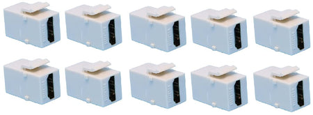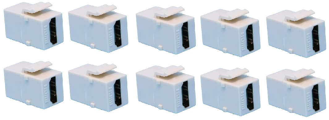 RiteAV Female to Female HDMI Keystone Couplers are the same on the front and back, so you can connect your HDMI Cabling to them in no time. Simply plug your HDMI Cables into both sides of the plate the same way. No tools are required. Theyre universally designed to easily fit standard-sized brand name keystone blank wall plates and fit seamlessly into all RiteAV Blank Wall Plates as well. Our HDMI Keystone Couplers are versatile, since they can also be used in surface mount boxes and patch panels that have a standard-sized opening. RiteAV Keystone Couplers are removable to allow for easy upgrades or plate re-configurations in the future. The sturdy construction of the couplers ensures a long service life and a simple, affordable way to keep your cables hidden. They also provide a neat, convenient way to extend cables that are already in place, without the need for relocating them. This discreet solution enables you to route your cabling through the walls and results in a clean, professional look behind wall mounted televisions, monitors, projectors and entertainment centers in both residential (home theater) and commercial (classroom, boardroom, factory floor, recording studio, etc.) settings. We offer a variety of couplers in an assortment of colors that all match our Blank Wall Plates to suit all of your A/V requirements. The 10 pack is a smart, economical choice when needing to purchase multiple jacks since it saves you money buying in bulk as well as numerous trips to the hardware store.