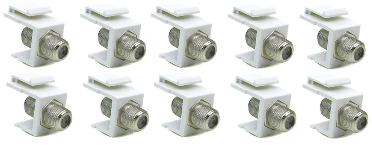RiteAV Female to Female Coax Keystone Couplers are the same on the front and back, so you can connect your Coaxial Cabling to them in no time. Simply connect your Coax Cables into both sides of the plate the same way. No tools are required. Theyre universally designed to easily fit standard-sized brand name keystone blank wall plates and fit seamlessly into all RiteAV Blank Wall Plates as well. Our Coax Keystone Couplers are versatile, since they can also be used in surface mount boxes and patch panels that have a standard-sized opening. RiteAV Keystone Couplers are removable to allow for easy upgrades or plate re-configurations in the future. The sturdy construction of the couplers ensures a long service life and a simple, affordable way to keep your cables hidden. They also provide a neat, convenient way to extend cables that are already in place, without the need for relocating them. This discreet solution enables you to route your cabling through the walls and results in a clean, professional look behind wall mounted televisions, monitors, projectors and entertainment centers in both residential (home theater) and commercial (classroom, boardroom, factory floor, recording studio, etc.) settings. We offer a variety of couplers in an assortment of colors that all match our Blank Wall Plates to suit all of your A/V requirements. The 10 pack is a smart, economical choice when needing to purchase multiple jacks since it saves you money buying in bulk as well as numerous trips to the hardware store.