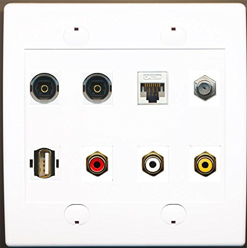 RiteAV 2 TOSLINK 1 CAT5E 1 COAX 1 USB-A-A 1 RCA RED-WHITE-YELLOW WALLPLATE WHITE Tooless connection Just plug one cable into the front and one into the back of each port. Wall plate looks the same on the front and back (female to female). Fits standard outlet boxes and low voltage mounting brackets. Jacks in RiteAV plates are removeable for future upgrades. High quality item. Screws included.