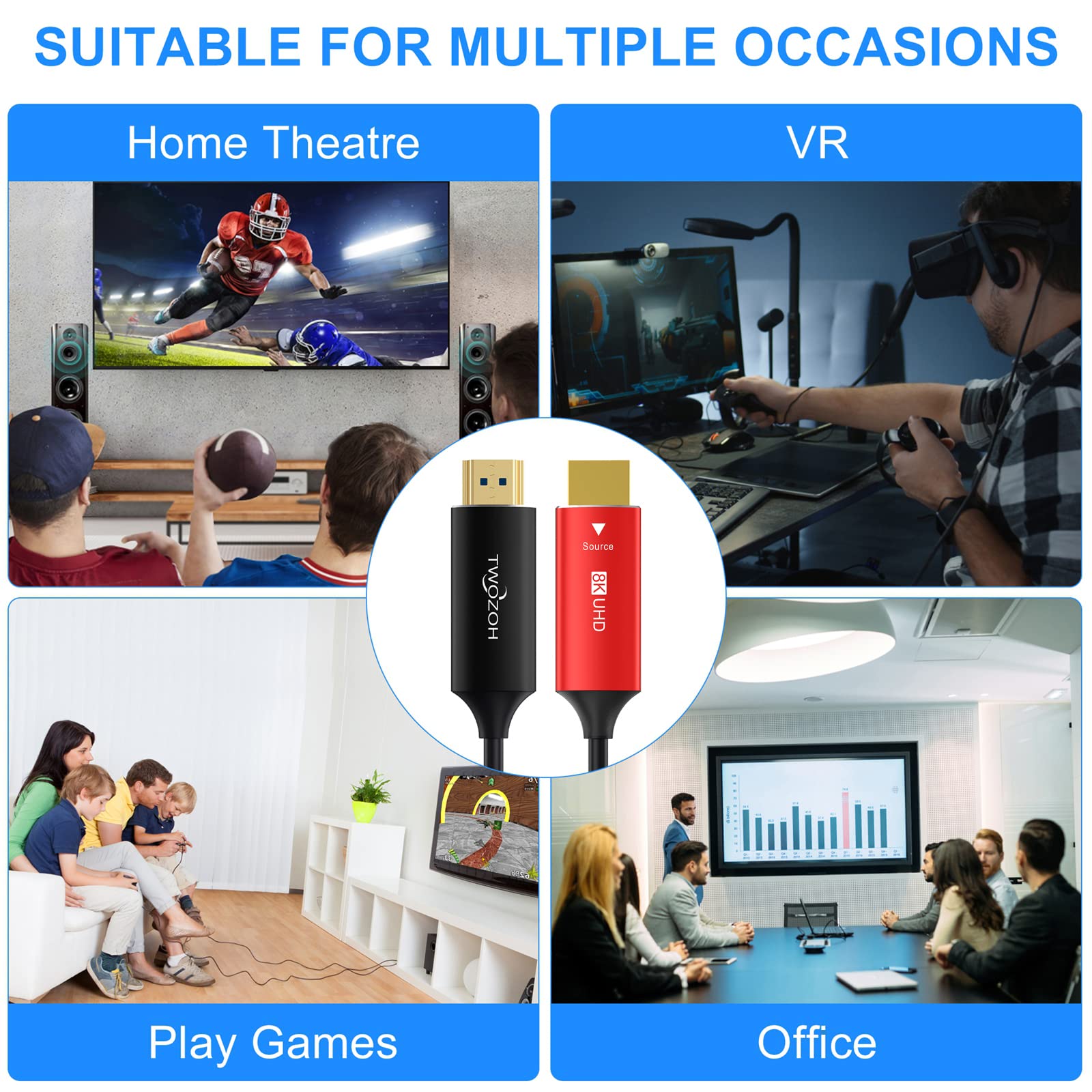 - [Hållbarhet och flexibel]: Twozoh 8K fiberoptiska HDMI-kablar tillverkade med fiberoptik når längre avstånd samtidigt som den upprätthåller hög transmission. 24K guldpläterade kontakter minskar risken för EMI/RFI i miljöer med hög störning.