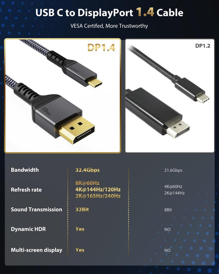 - 【Stöder UHD-upplösningar från 8K vid 60Hz.】Maxonar USB C till Displayport 1.4-kabel stöder upplösningar från 8 K (7680x4320) vid 60 Hz, 5 K (5120 x 2880) vid 60 Hz, 5120 x 1440 vid 120 Hz, 4K (3840 x 2160) vid 60 Hz/120 Hz/144 Hz, 2 K vid 120 Hz/165 Hz/240 Hz. Maxonar USB C till DP1.4-adapter bakåtkompatibel med DisplayPort 1.3, 1.2 och 1.1. (Observera: Denna kabel är kompatibel med Samsung Odyssey G9 CHG90 CRG9. Uppdatera din MacOS/Windows till den senaste versionen.)
