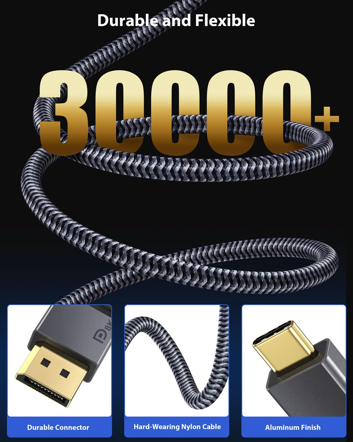 - Maxonar DisplayPort USB C-kabel av dubbelflätad nylon med en kabellängd på 3 m (10 fot) möjliggör problemfri anslutning över långa avstånd. Guldpläterad för kontakt.